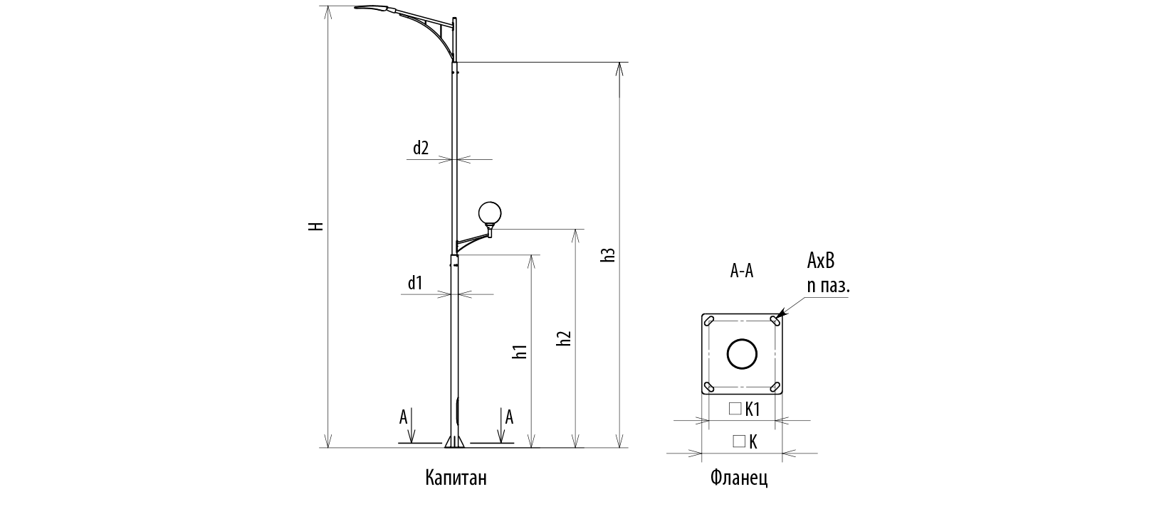 Особенность фонаря Капитан - расположение светильники двух типов назначения на разной высоте. В верхней части опоры на стальном кронштейне устанавливается консольный светильник, обеспечивающий заливающее освещение улицы и / или проезжей части (есть модели с двумя светильниками под углом 180 градусов). Светильник торшерного типа размещается на опоре гораздо ниже, на небольших кронштейнах, с целью освещения пешеходных зон.